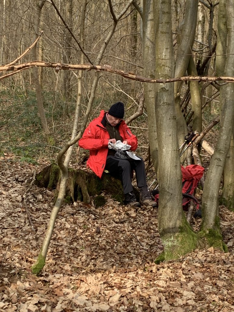 Pol a prévu un endroit pour le pique-nique. Dans la ligne droite avant l’entrée du bois de Waibes, il y a 19 randonneurs. Pour Coco les trois devant vont monopoliser le restaurant. En effet, arrivés au point de vue brumeux qui donne sur Thuin et son beffroi caractéristique, les places sont prises. Pol a un plan B, qui deviendra un plan T comme talus qui procurera un certain confort pour la collation du midi. La météo n’est pas trop mauvaise avec un soleil un peu timide.