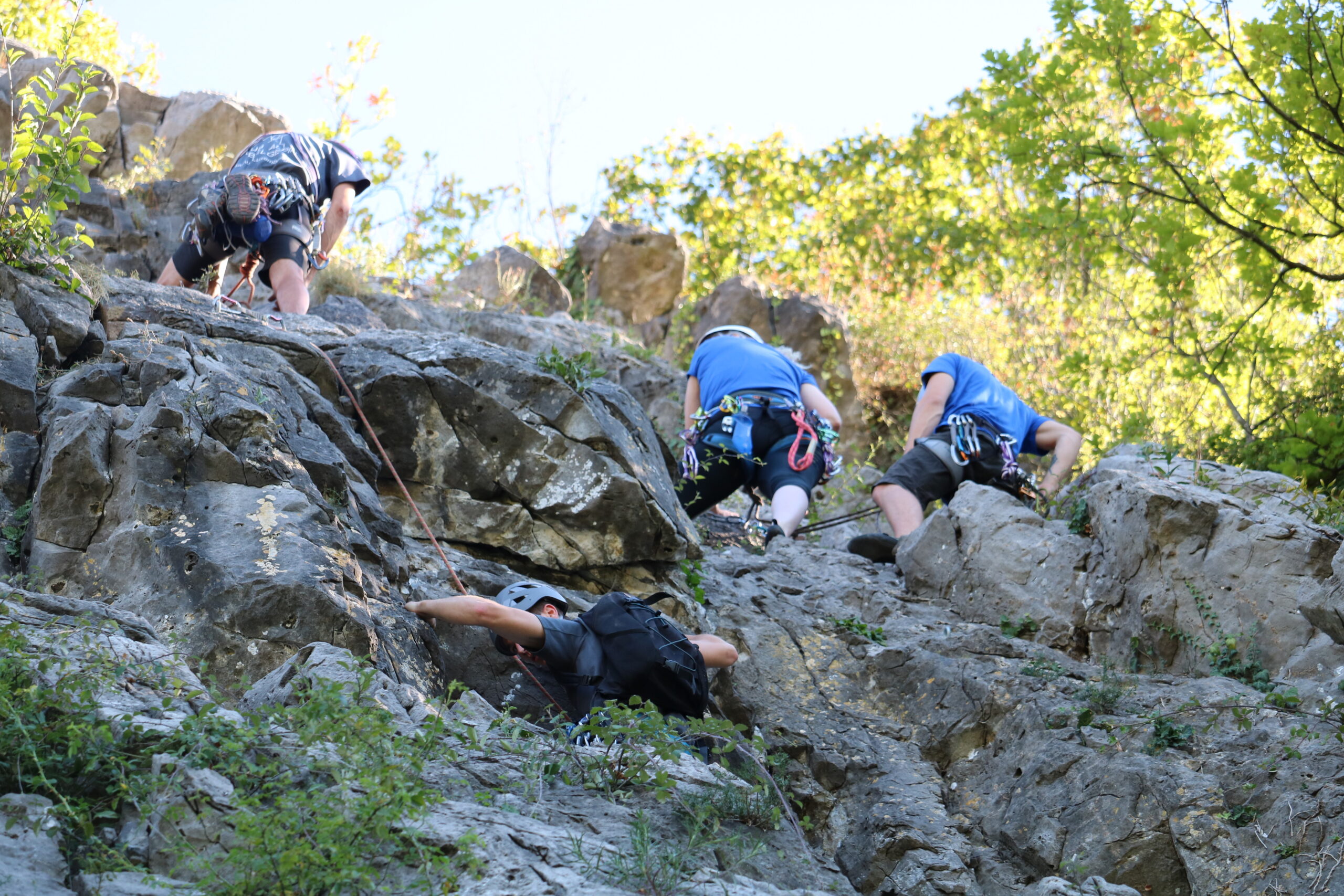 Contenu : les 4 premiers jours (partie 1er de cordée) consistent en une révision et confirmation des connaissances de base de l’escalade en tête (connaissances théoriques du matériel, équipement, nœuds, gestuelle de base, voies d’1 et de plusieurs longueurs, rappel). Cette phase est indispensable même pour ceux qui grimpent déjà en tête depuis quelque temps afin d’être certain de partir sur de bonnes bases et de ne pas devoir revenir ensuite sur celles-ci pendant la partie spécifiquement animateur SNE.